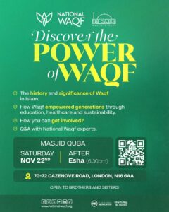 Join National Waqf for an inspiring presentation at Masjid Quba The Power of WaqfSaturday, 22nd NovemberAfter Esha (6:30 PM)70–72 Cazenove Road, London, N16 6AA Learn about:The history and significance of Waqf in IslamHow Waqf empowered generations through education, healthcare and sustainability How you can get involved Q&A with National Waqf experts Open to brothers and […]
